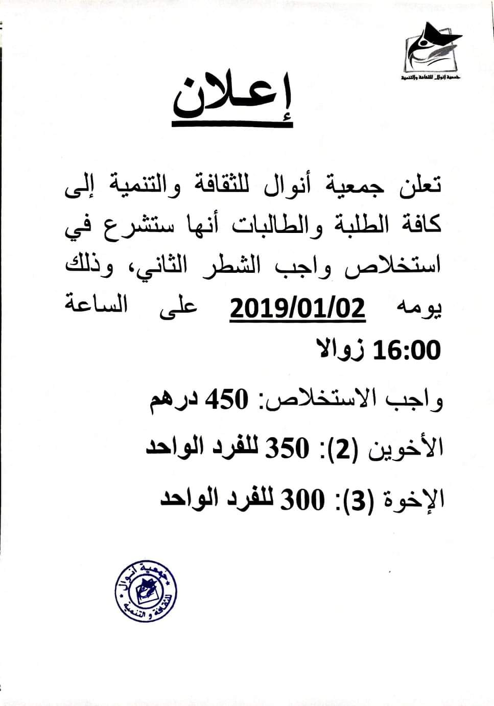 تعلن جمعية انوال للثقافة والننمية الى عموم الطلبة والطالبات انها ستشرع في استخلاص واجبات الاستفادة من النقل الجامعي (الشطر الثاني ) وذلك يوم 02/01/2018، بدار الشباب على الساعة 16.00 مساء.
