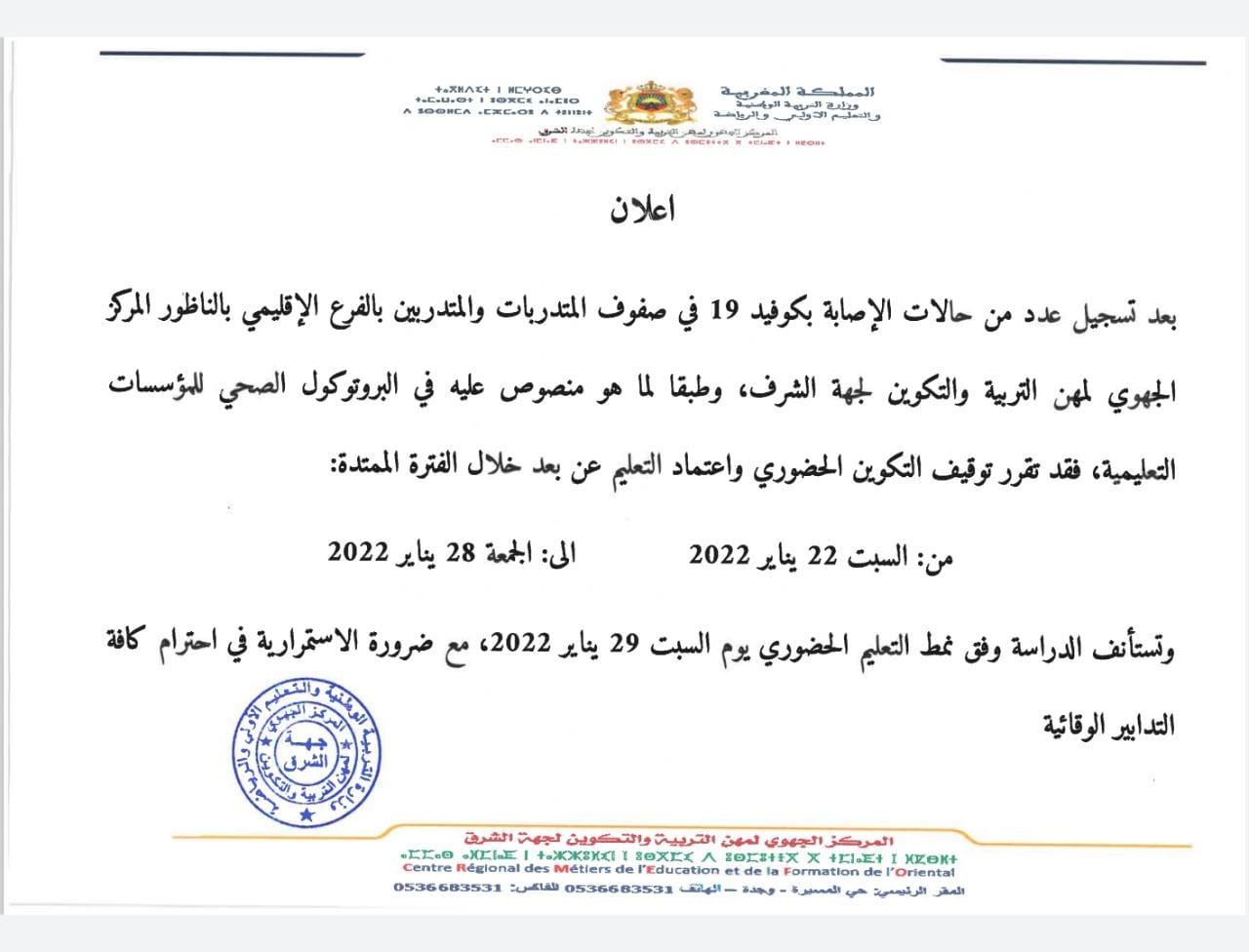 أعلن الفرع الإقليمي بالناظور للمركز الجهوي لمهن التربية و التكوين لجهة الشرق، زوال اليوم السبت، عن توقيف التكوين الحضوري و اعتماد التكوين عن بعد خلال الفترة الممتدة بين السبت 22 يناير إلى الجمعة 28 يناي 2022.