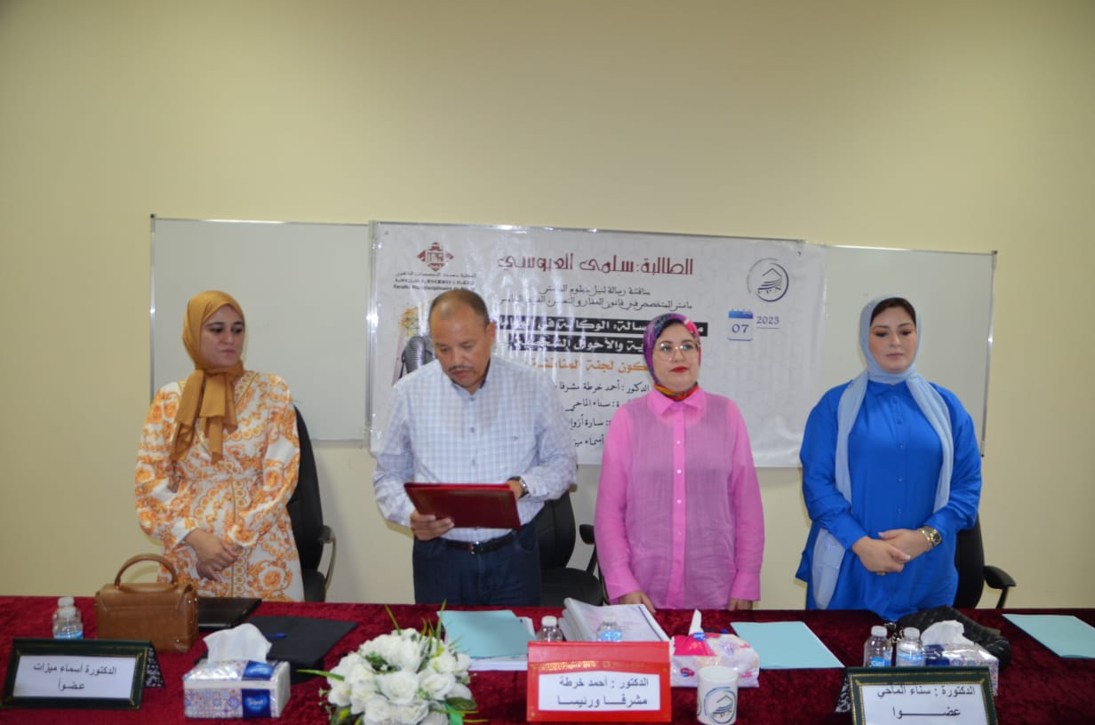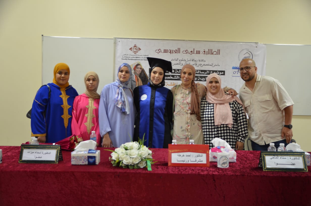 وبعد المناقشة التي دامت لحوالي ساعتين، وانتقال أعضاء اللجنة للمداولة، قررت اللجنة منح الطالبى الباحثة ” سلمى العبوسي” دبلوم الماستر في القانون الخاص بميزة مشرف جدا مع التوصية بالنشر.