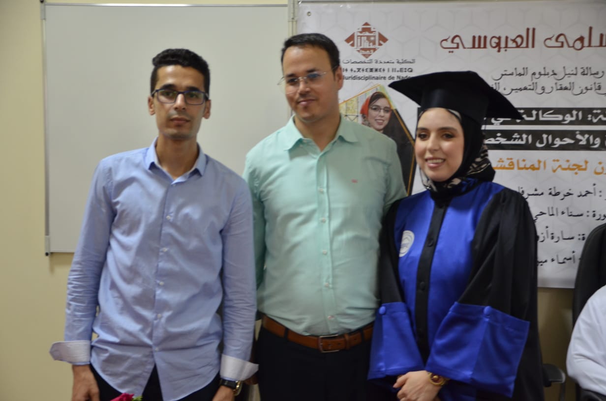 ناقشت الطالبة الباحثة “سلمى العبوسي “، اليوم الجمعة 07/07/2023، بكلية الناظور متعددة التخصصات بالناظور رسالتها لنيل دبلوم الماستر في الماستر المتخصص في قانون العقار والتعمير – وذلك تحت عنوان ” الوكالة في المعاملات العقارية والأحوال الشخصية.