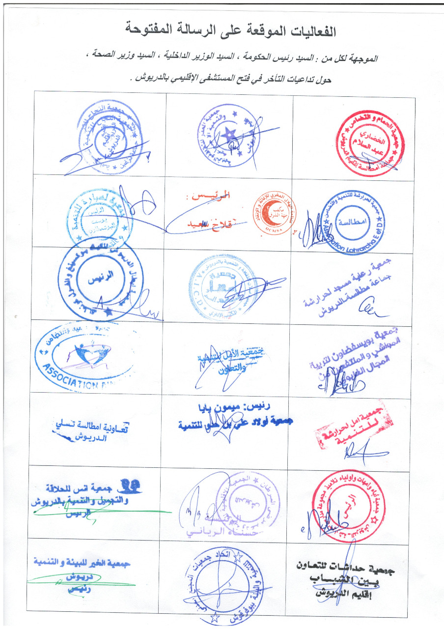 وجه أزيد من 50 تنظيم جمعوي حقوقي ونقابي فاعل بمدينة الدريوش رسالة احتجاج مفتوحة لكل من رئيس الحكومة ووزيري الصحة والداخلية بسبب التأخر في فتح المستشفى الإقليمي بالدريوش رغم الانتهاء من أشغال بنائه وتجهيزه منذ أشهر.