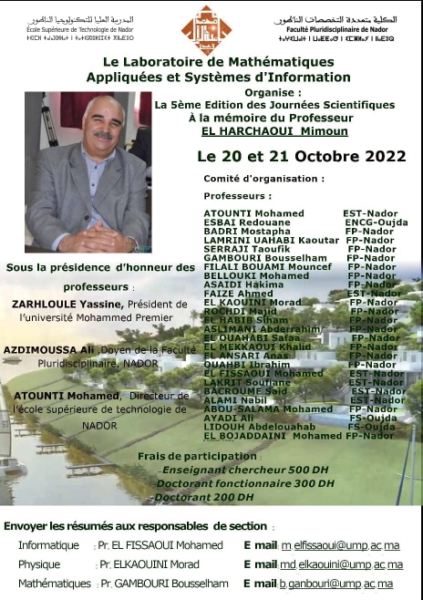 نظم مختبر الرياضيات التطبيقية ونظم المعلومات بالكلية المتعددة التخصصات بالناظور بشراكة مع المدرسة العليا للتكنولوجيا بالناظور يومي 20 و21 اكتوبر 2022 النسخة الخامسة من الايام الدراسية برحاب الكلية تخليدا لذكرى وفاة الأستاذ الجامعي ميمون الحرشاوي ” نائب العميد سابقا..