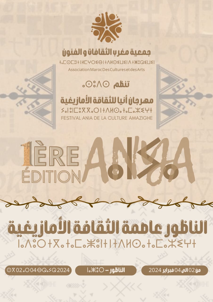 تنزيلا لمضامين خطاب أجدير التاريخي الذي ألقاه صاحب الملك محمد السادس سنة 2001 وما عقبه من خطابات ملكية سامية ، وفي سياق الإقرار التاريخي لرأس السنة الأمازيغية كعطلة رسمية ، وما يحمله من دلالات عميقة تصب في تكريس الطابع الأمازيغي في صلب الهوية المغربية المتنوعة الروافد ، تنظم جمعية مغرب الثقافات والفنون ، في الفترة الممتدة من 02 إلى 04 فبراير 2024 النسخة الأولى من مهرجان أنيا للثقافة الأمازيغية تحت شعار “الناظور عاصمة للثقافة الأمازيغية” .