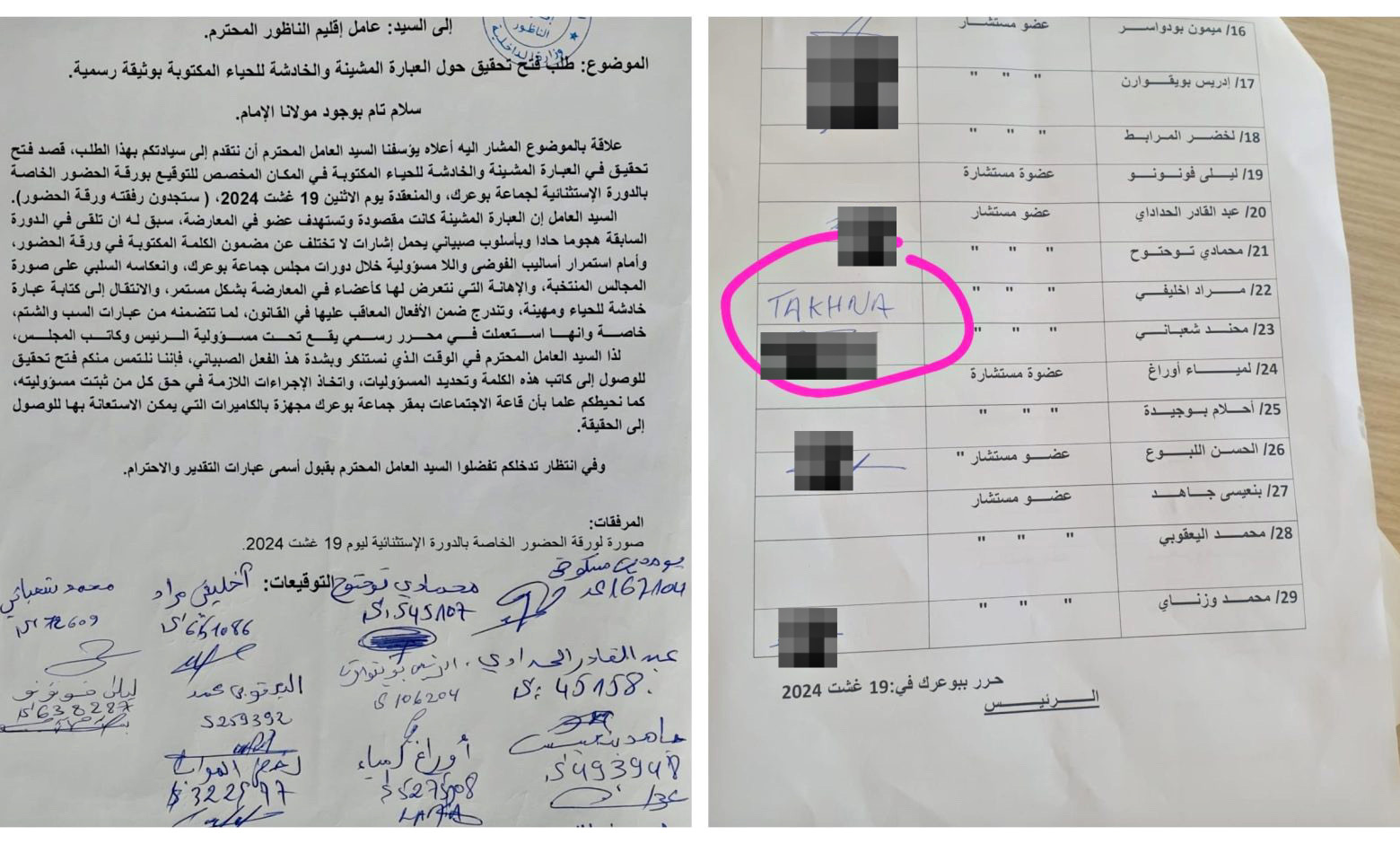 قدم 14 عضوا منتخبًا من المجلس الجماعي لبوعرك، طلبا إلى عامل إقليم الناظور لفتح تحقيق عاجل حول عبارة “مشينة” و”خادشة للحياء” وجدت مكتوبة في وثيقة رسمية أثناء انعقاد الدورة الاستثنائية لشهر غشت الجاري، وقد أثارت الحادثة التي وقعت بداية هذا الأسبوع استنكارا واسعا بين الأعضاء الحاضرين، ووصفت بأنها إهانة لا يمكن التغاضي عنها.