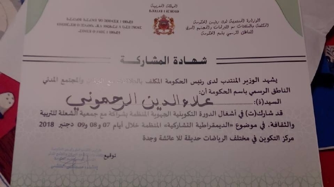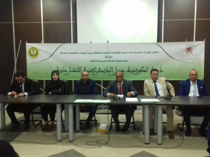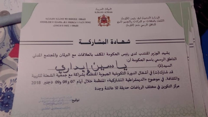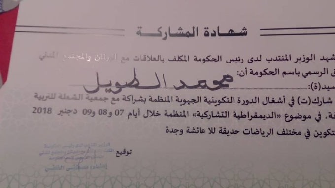 نظمت الوزارة المنتدبة لدى رئيس الحكومة المكلفة بالعلاقات مع البرلمان و المجتمع المدني بشراكة مع جمعية الشعلة للتربية و الثقافة ، دورة تكوينية بجهة الشرق حول موضوع ‘ الديمقراطية التشاركية ‘ أيام 7 .8.9 دجنبر 2018 بمركز الأبحاث و الدراسات الإسلامية و الإجتماعية و مركز الرياضات الجماعية بوجدة، قرب حديقة لالة عيشة .