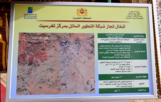 وقام عامل الإقليم، بحضور وفد هام، يضم رئيس وأعضاء مجلس جماعة تفرسيت، ورئيس المجلس الإقليمي، والبرلمانيين، وكبار المسؤولين الأمنيين والعسكريين، ورؤساء المصالح الخارجية، وفعاليات المجتمع المدني، على إعطاء انطلاقة انجاز مشروع التطهير السائل لمركز الجماعة، والذي رصدت له استثمارات مالية تقدر بـ4.5 مليار سنتيم، وذلك في إطار اتفاقية شراكة بين جماعة تفرسيت والوكالة المستقلة الجماعية لتوزيع الماء والكهرباء بوجدة..