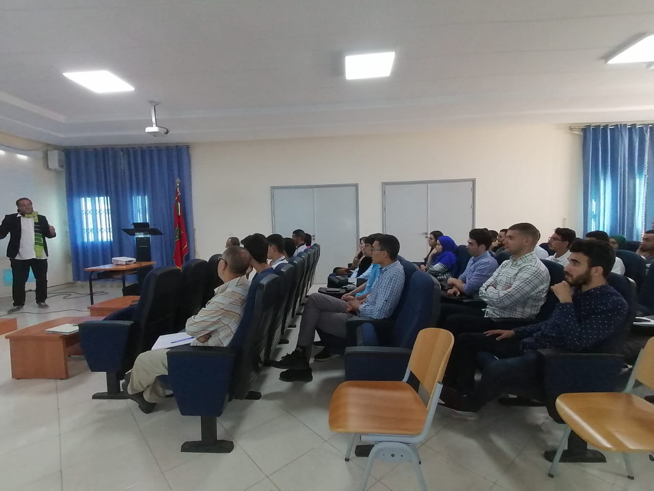 وقد عرف اليوم حضور من الطلبة والأساتذة والعموم بالإضافة لحضور ممثل عن مدير وكالة تهيئة بحيرة مارتشيكا الذي نقل ممثلها رغبة الوكالة الجادة في فتح شراكة مستقبلية مع منسق هذا الماستر وطلبته الجدد.