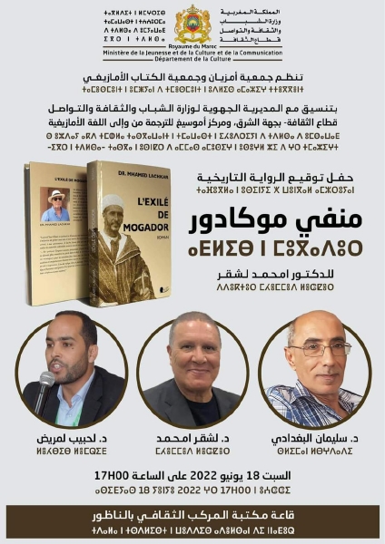 نظمت كل من جمعية أمزيان وجمعية الكتاب الأمازيغي بتنسيق مع المديرية الجهوية لوزارة الشباب والثقافة والتواصل -قطاع الثقافة- بجهة الشرق، ومركز أموسيغ للترجمة من وإلى اللغة الأمازيغية، حفل توقيع الرواية التاريخية “منفي موكادور”، مساء يوم السبت 18 يونيو 2022 بمكتبة المركب الثقافي بالناظور، هذا اللقاء الأدبي التاريخي الذي تصادف مع اليوم الوطني للمقاومة، عرف نجاحا كبيرا أمام الحضور النوعي للمهتمين والباحثين والشغوفين للقراءة والاطلاع، وأمام القيمة الأدبية وكذلك التاريخية للكتاب المحتفى به، والذي يعد الإصدار الرابع للكاتب الدكتور امحمد لشقر، ابن مدينة الحسيمة، بعد كتابه الأول “كوربيس؛ “طريقي نحو الحقيقة والصفح” سنة 2010، والذي تمت ترجمته إلى العربية، مرورا بروايته الثانية “على طريق الممانعين” سنة 2015، ثم روايته الثالثة “الحرب لم تكن حربنا” سنة 2018.